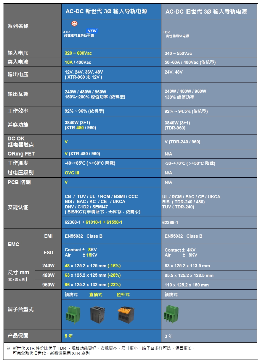 全新XTR系列在尺寸、效率、功能規格、保固期、安規認證及價格等方面,全面優于舊世代 TDR 系列,具備更高性價比,可完全取代TDR系列。主要升級差異包括: