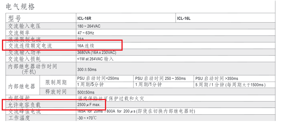 根據以下ICL-16R規格書得知其交流連續額定電流為16A,最大允許電容負載為2500μF。