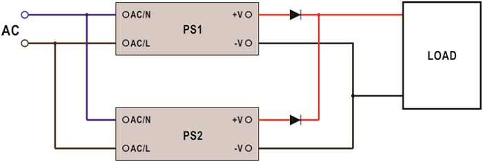 以下為針對冗余應用的簡短說明:傳統冗余電源接法是由2個或多個電源于正端分別串接二極管的方式并聯輸出至電源總線上,如圖二所示??梢宰?個電源單獨工作,也可以讓多個電源同時工作。當其中1個電源出現故障時,由于二極管的單向導通特性,不會影響電源總線的輸出。