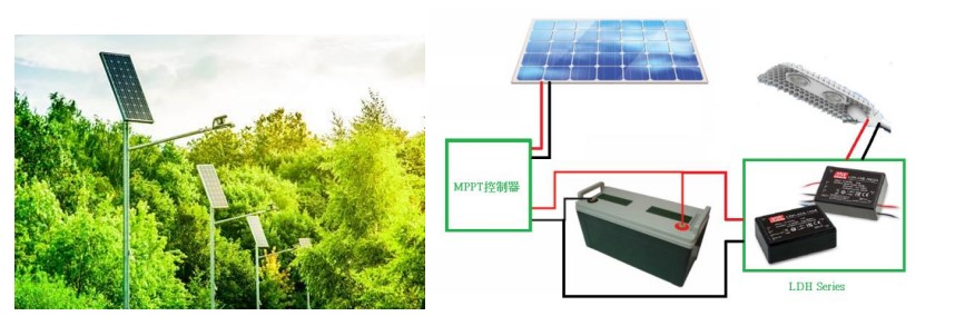 太陽能作為一種綠色環保的新能源,“取之不竭、用之不盡”。充分利用太陽能資源,對緩解常規能源緊張的情況有積極意義,且安全節能無污染,故許多中低功率路燈會改采太陽能路燈解決方案,當太陽能路燈功率需求較高時,會采用升壓式DC - DC LED驅動器,如此可以增加LED串接數并減少LED并聯數,相對降壓式減少了電流并減少損耗,提升太陽能路燈效能。如圖4所示,太陽能板于日照充足時,透過MPPT控制器對電池充電,通常為了安全考慮,所以會使用低壓電池,如12VDC或24V DC電池,如此會有較穩定的充電效能。在晚上時,電池可透過燈具內部的升壓式DC –DC LED驅動器LDH-25/45(DA)/65,將電池電壓12V或24V升壓,以提供給較高瓦數的太陽能LED路燈或移動式LED照明燈具使用,以達到綠能照明的應用?;蚩纱钆湟话闫嚮虼半姵厥褂?,搭配升壓式的LED驅動電源,做直流供電照明應用,如圖5示意。