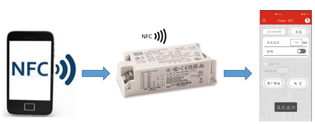 明緯近期推出新一代XLN/XLC-NFC系列產品,用戶可使用具有NFC功能的智能裝置,在產品沒有AC輸入的情況下,透過明緯APP近距離感應快速設定輸出電流,以匹配不同燈具應用。